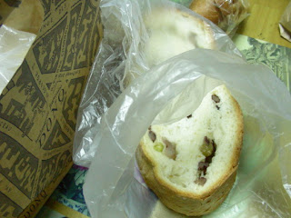 高雄漢神百貨DONQ每天下午5點都會推出限量巨無霸法國麵包,今天第一次嘗試免來嚐嚐,很幸運排到第一位,其實4:50我就在麵包店徘徊,結果在麵包出爐的前1分鐘,有一位排在我後面的媽媽竟然把我趕到後面,說什麼他兒子比我早到,我應該要去後面重新排;因為他們是一家人在等,我ㄧ個人勢單力薄,根本說不過他們,只好被擠到後面,好像一個窩囊廢,氣炸了!鴨霸的老婦人,就仗著自己家人在一旁,就擠人,有本事事後就別一直回頭用虧欠的表情看人。不過麵包真的很好吃,剛出爐還會燙人,但是我在網路上看到的是包cheese,今天買的是包各種豆類﹝花豆、紅豆、綠豆﹞,我也搞不清楚,不過應該都很好吃。
